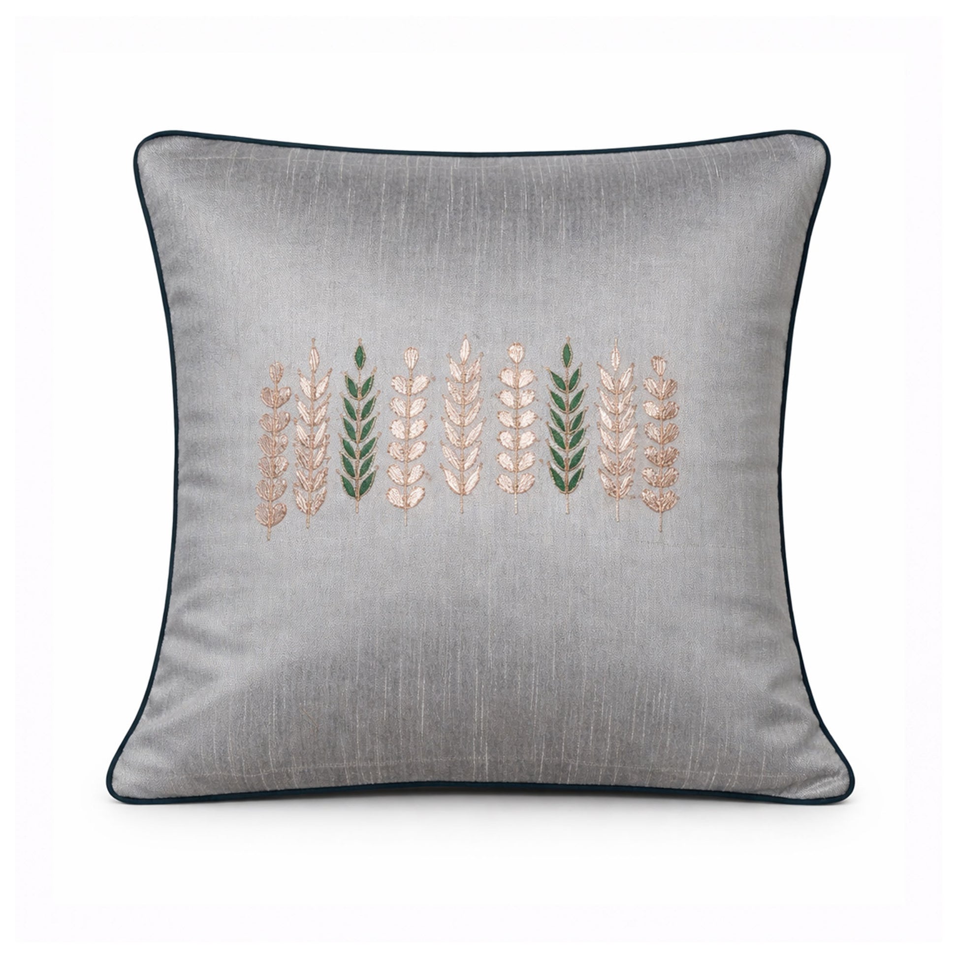 Indulge in the serene beauty of the Silken Grace cushion cover, where understated elegance meets the timeless art of embroidery. The grey silk fabric, smooth and cool to the touch, provides a perfect canvas for the delicate gotta patti leaf stems that gracefully wind across the surface. The green stems stand as a symbol of life, growth, and nature's quiet resilience.