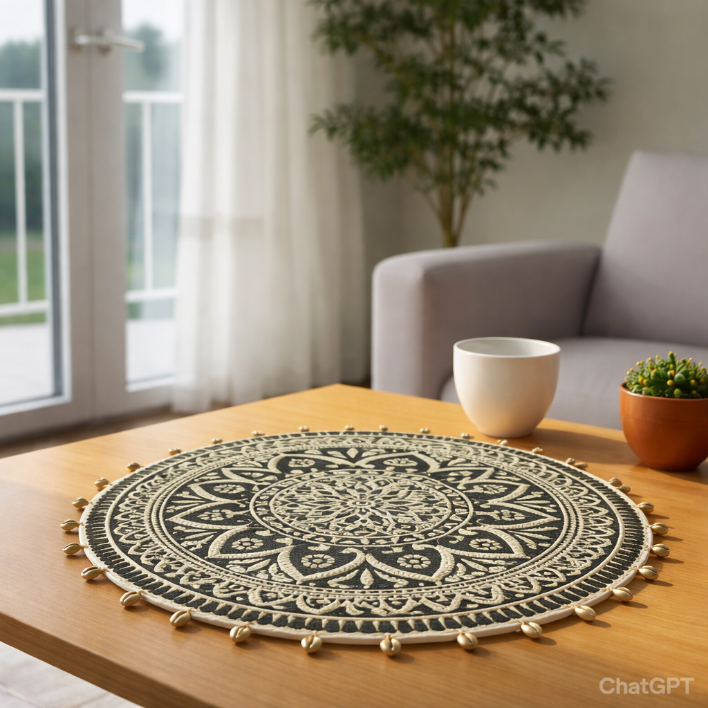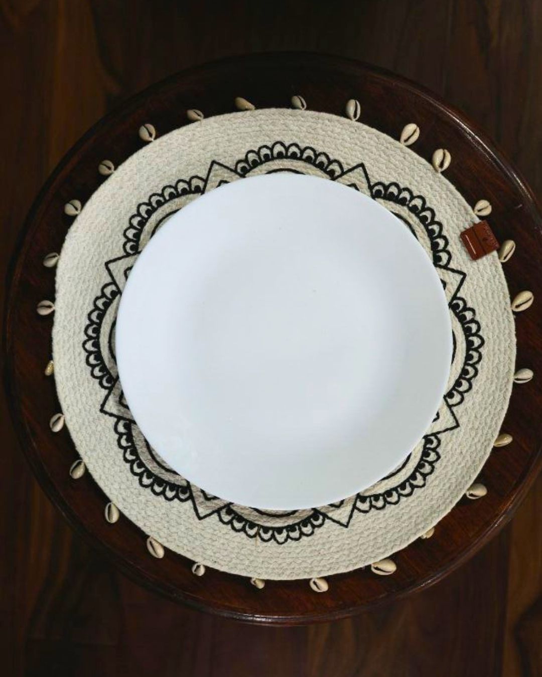 The Mandala Glow Table Mat brings a touch of serenity and elegance to your dining space. The striking black mandala, set against a soft white background, symbolizes balance and harmony, infusing your table with a sense of peace. Each piece is handcrafted with love and care, with Kodi detailing and cowrie shells paying homage to the rich heritage of coastal culture, all while embracing sustainable living.